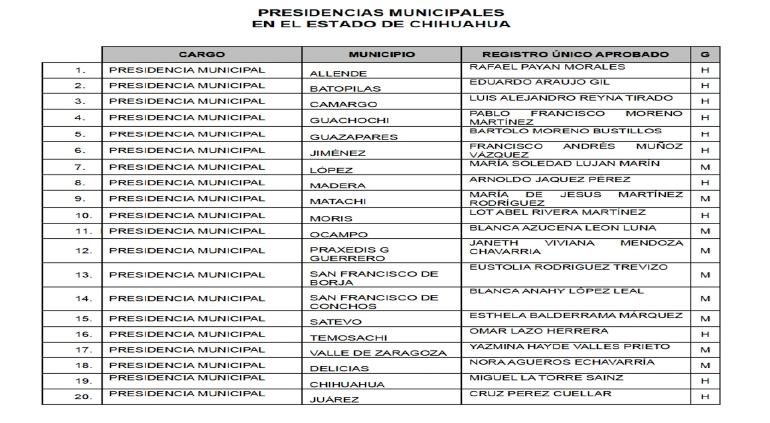 Leer másChihuahua.- A través de redes sociales Morena dio a conocer los nombres de las personas que contenderán a nivel local por un cargo de elección popular, es decir a diputaciones al Congreso del Estado y a alcaldías. Para presidencias municipales en Juárez buscará la reelección Cruz Pérez Cuellar, en la capital del estado el candidato será Miguel La Torre,mientras que en Delicias estará en la boleta Nora Agüeros, en Camargo Luis ...