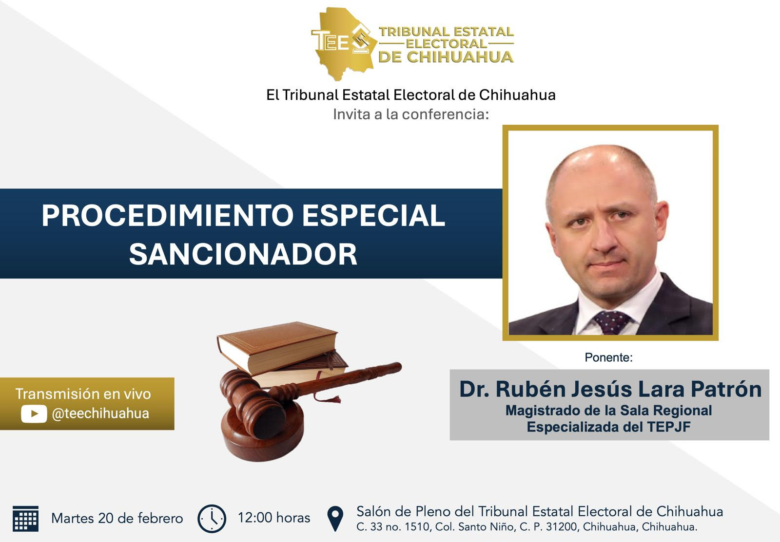 Leer másChihuahua.- El Doctor Rubén Jesús Lara Patrón, Magistrado de la Sala Regional Especializada del Tribunal Electoral del Poder Judicial de la Federación, impartirá la conferencia “Procedimiento Especial Sancionador” (PES) la cuál se llevará a cabo el próximo martes 20 de febrero en punto de las 12:00 horas en el Salón de Pleno del Tribunal Estatal Electoral de Chihuahua. La Sala Regional Especializada está encargada de resolver los los procedimientos especiales sancionadores relacionados ...