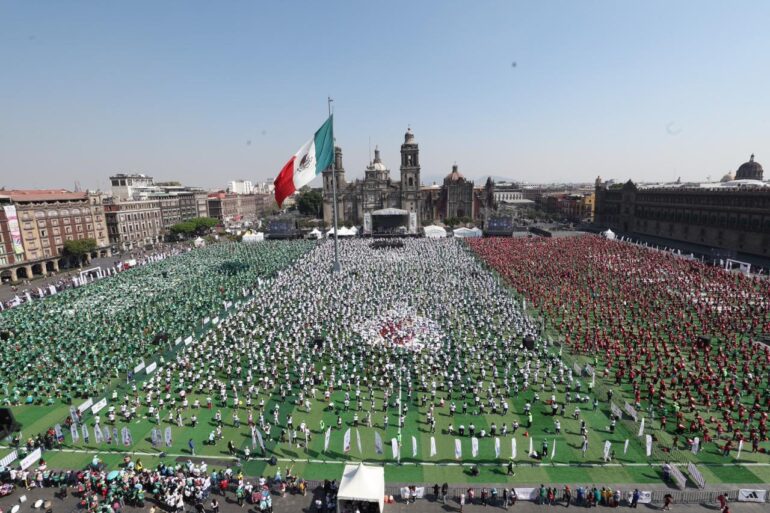 Leer másMéxico.- Como parte de las acciones del Mundial Social rumbo a la Copa Mundial de la FIFA 2026, la Secretaría de Turismo federal y el Gobierno de la Ciudad de México anunciaron que este domingo se rompió el Récord Guinness de “La clase de futbol más grande del mundo”, realizada en el Zócalo capitalino, en la que participaron 9 mil 500 personas. La secretaria de Turismo del Gobierno de México, Josefina ...