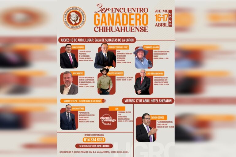 Leer másChihuahua.- La Unión Ganadera Regional de Chihuahua (UGRCH) realizará la tercera edición del Encuentro Ganadero Chihuahuense, donde se contará nuevamente con investigadores y especialistas de talla nacional e internacional, los días 16 y 17 de abril. El evento es organizado por el Consejo Directivo presidido por el Lic. Álvaro Iván Bustillos Fuentes, en el marco de la 90 Asamblea General Anual. Se trata de un evento gratuito que busca llevar información ...