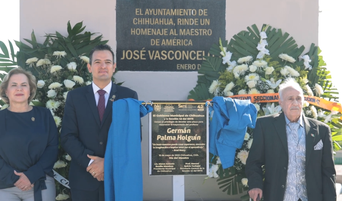 Leer másChihuahua.- En conmemoración del Día del Maestro, el alcalde de Chihuahua, Marco Bonilla, encabezó, en la explanada de El Palomar, los honores a la bandera y la develación de una placa en honor a Germán Palma Holguín como Maestro Ilustre edición 2023. El reconocimiento “Maestro Ilustre” se realiza de manera anual para agradecer a destacados docentes que han causado un gran impacto en la sociedad; en este sentido se reconoció a ...