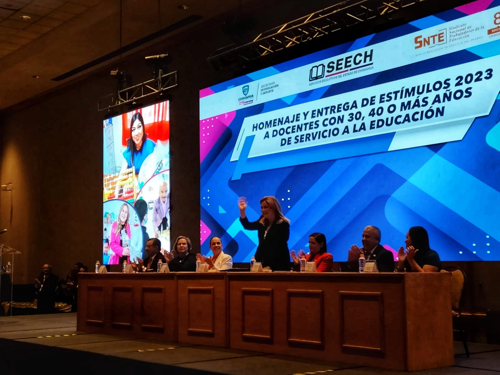 Chihuahua.- La gobernadora, Maria Eugenia Campos Galván encabezó el Festejo de la Sección 8 del Sindicato Nacional de los Trabajadores de la Educación (SNTE), con motivo del día del maestro. Durante la celebración se realizo, también la entrega de estímulos a docentes con, 30, 40 o más años de servicio a la educación, quienes recibieron un reconocimiento, así como un bono. En este tenor, Eduardo Antonio Zendejas Amparán, secretario general de la ...