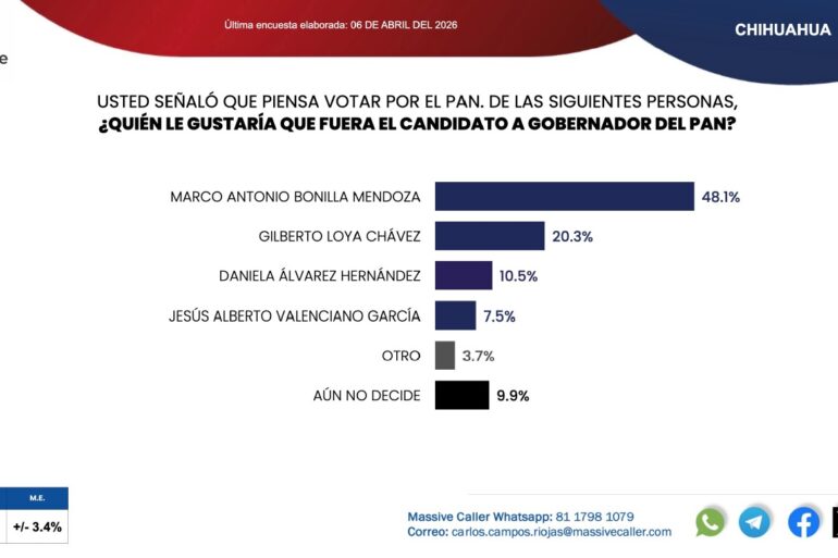 Leer másChihuahua.- Derivado de la última encuesta publicada por Massive Caller, enfocada en medir aspectos relacionados a elecciones populares y política, el Secretario de Seguridad Pública Estatal (SSPE), Gilberto Loya, tuvo un incremento en el promedio de personas que lo reconocen como un posible candidato a la gubernatura. La encuesta, elaborada el pasado 6 de abril posicionó al militante del Partido Acción Nacional (PAN) con 20.3% en las preferencias. La disminución en niveles ...