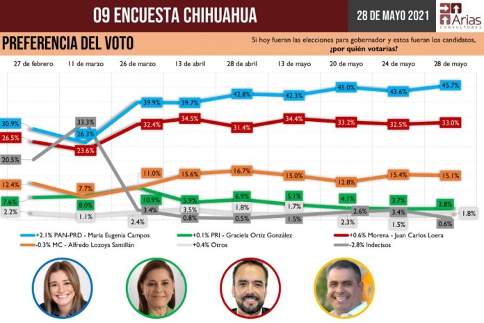 Leer másChihuahua.- A menos de una semana de los comicios electorales, este lunes, las encuestadoras más reconocidas del país coinciden en que Maru Campos cuenta con la preferencia de los ciudadanos, por lo que será la próxima gobernadora de Chihuahua. En la medición al 28 de mayo, la encuestadora Arias Consultores da a Maru Campos una ventaja de más de 12 puntos, pues la ubica en la delantera con 45.7%, mientras que ...