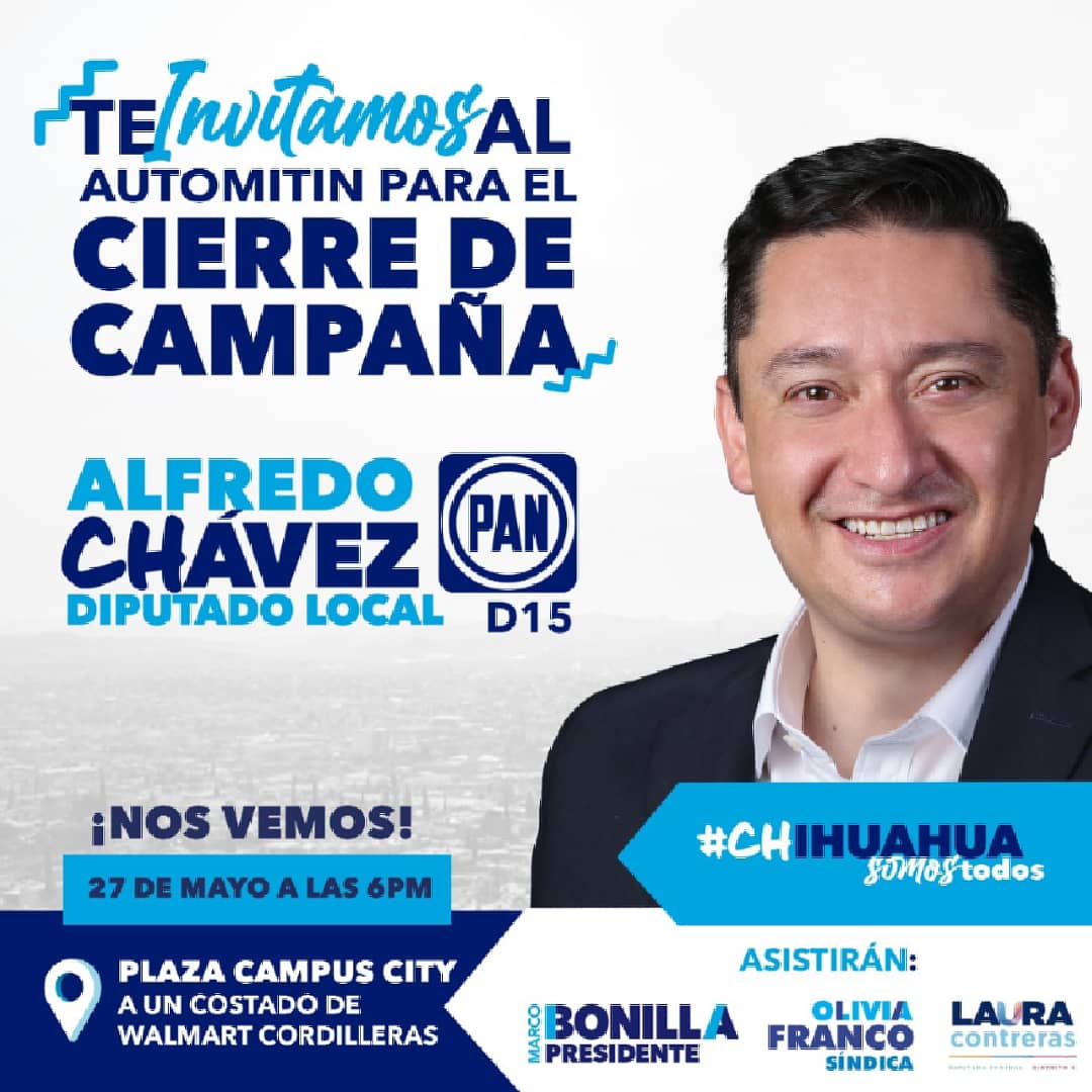 Leer másChihuahua.-El candidato del PAN a diputado por el distrito 15, Alfredo Chávez Madrid, invita a la ciudadanía para ser copartícipes del automitin de cierre de campaña donde refrendará los compromisos, así como los acuerdos que construyó en conjunto por la ciudadanía y que serán patentes para ser realidad con el voto a favor el próximo 6 de junio. Alfredo Chávez ha organizado un encuentro de cara a la ciudadanía del distrito ...