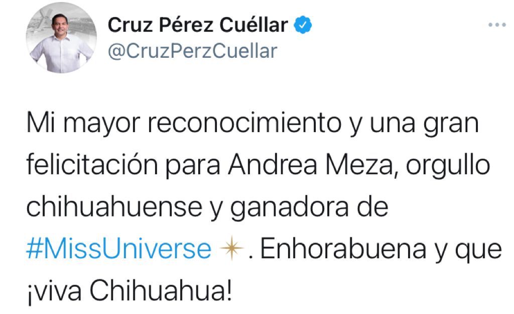 Leer másCiudad Juárez. - Cruz Pérez Cuéllar, candidato a la presidencia municipal, por Morena, en la Coalición Juntos Haremos Historia en Chihuahua, felicita con gran afecto a la chihuahuense Andrea Meza, Miss Universo 2021. “Es un motivo muy grande de orgullo, tan grande como lo es Andrea Meza, Miss Universo 2021; Chihuahuense, ingeniera, trabajadora incansable en la promoción de su estado, de nuestro estado; de Chihuahua” La felicitamos desde Ciudad Juárez, porque su ...