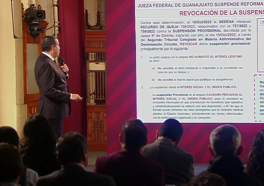 Leer másMéxico.- El subsecretario de Seguridad, Ricardo Mejía Berdeja, acusó que Karla María Macías Lovera, del Juzgado Noveno de Distrito de Guanajuato, se ha excedido en sus facultades por sus fallos contra la transferencia de la Guardia Nacional a la Secretaría de la Defensa Nacional con lo que “pone en riesgo la segura y genera impunidad”. El funcionario recordó que primero emitió una suspensión provisional que frenó que el control operativo de ...