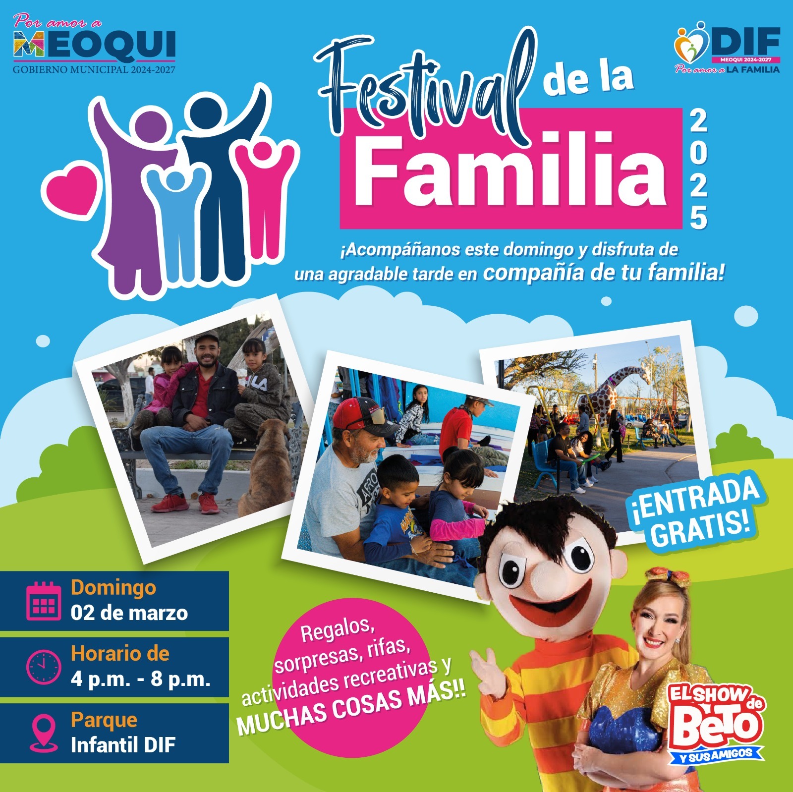 Meoqui, Chih.- Con festival, dulces, regalos y un show de Bely y Beto, en Meoqui celebrarán el Día Internacional de la Familia, el cual se realizará este domingo 2 de marzo en las instalaciones del Parque del DIF, otorgando además la entrada totalmente gratuita a partir de las 4 de la tarde, por lo que Gobierno Municipal, a través del Desarrollo Integral de la Familia extiende una invitación a toda la ciudadanía de la región en general.