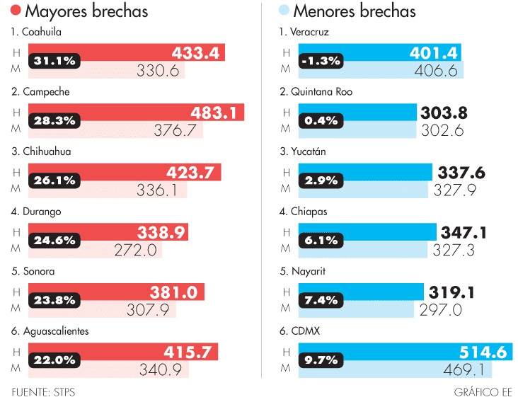 El estado con la brecha más amplia fue Coahuila, con 31.1%: 433.4 pesos de salario del sector formal para los hombres, y 330.6 pesos para las mujeres. Le siguieron Campeche (brecha de 28.3%), Chihuahua (26.1%), Durango (24.6%), Sonora (23.8%) y Aguascalientes (22.0 por ciento).