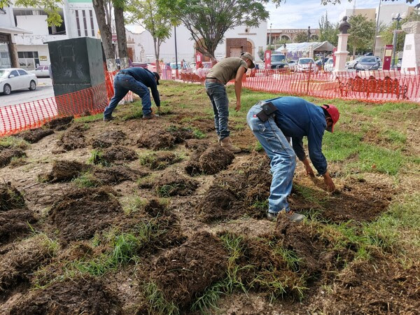 Chihuahua.- El Gobierno Municipal, a través de la Dirección de Mantenimiento Urbano, continúa con las labores de colocación de pasto en diversas plazas de la ciudad, acudiendo ahora a la plaza ubicada frene al templo San Francisco de Asís, en la calle Libertad.