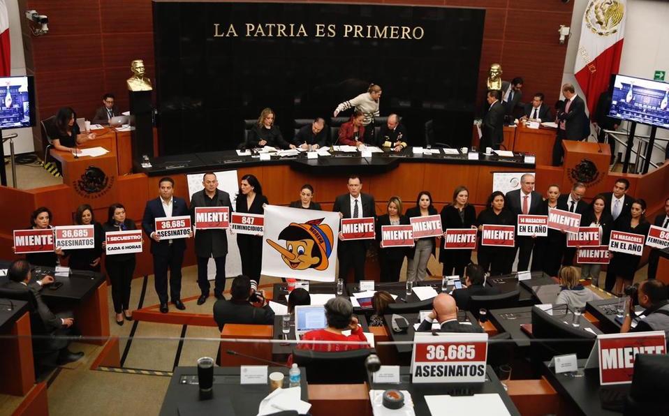 La bancada del PAN en el Senado protestó durante la comparecencia del secretario de Seguridad, Alfonso Durazo, por los resultados del operativo en Culiacán, el 17 de octubre, para capturar a Ovidio Guzmán, hijo de Joaquín El Chapo Guzmán.
