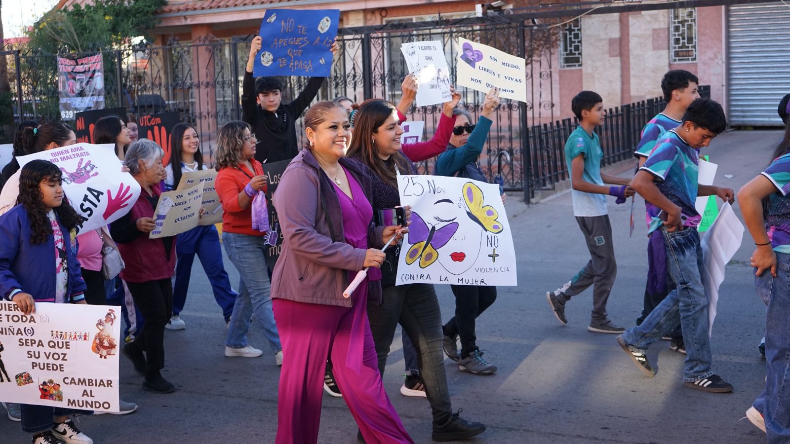 Meoqui.- Con la participación de más de 100 personas de distintas instituciones educativas, asociaciones civiles y ciudadanía en general, el Gobierno Municipal de Meoqui llevó a cabo la marcha conmemorativa por el Día Internacional de la Eliminación de la Violencia contra la Mujer, donde también se realizaron diferentes presentaciones artísticas, así como charlas y ferias de servicios.