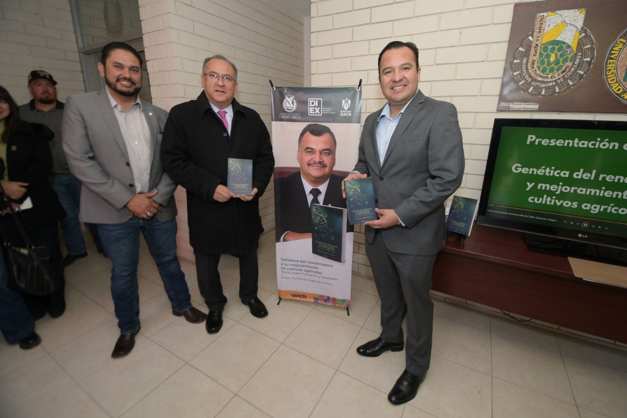 Delicias.- El maestro Luis Alfonso Rivera Campos, rector de la Universidad Autónoma de Chihuahua, encabezó la ceremonia de clausura de las actividades realizadas en el marco del 45.° Aniversario del Posgrado, con la presentación del libro “Genética del rendimiento y su mejoramiento en cultivos agrícolas. Teoría, experimentación y resultados”, de la autoría del Dr. Armando Segovia Lerma.