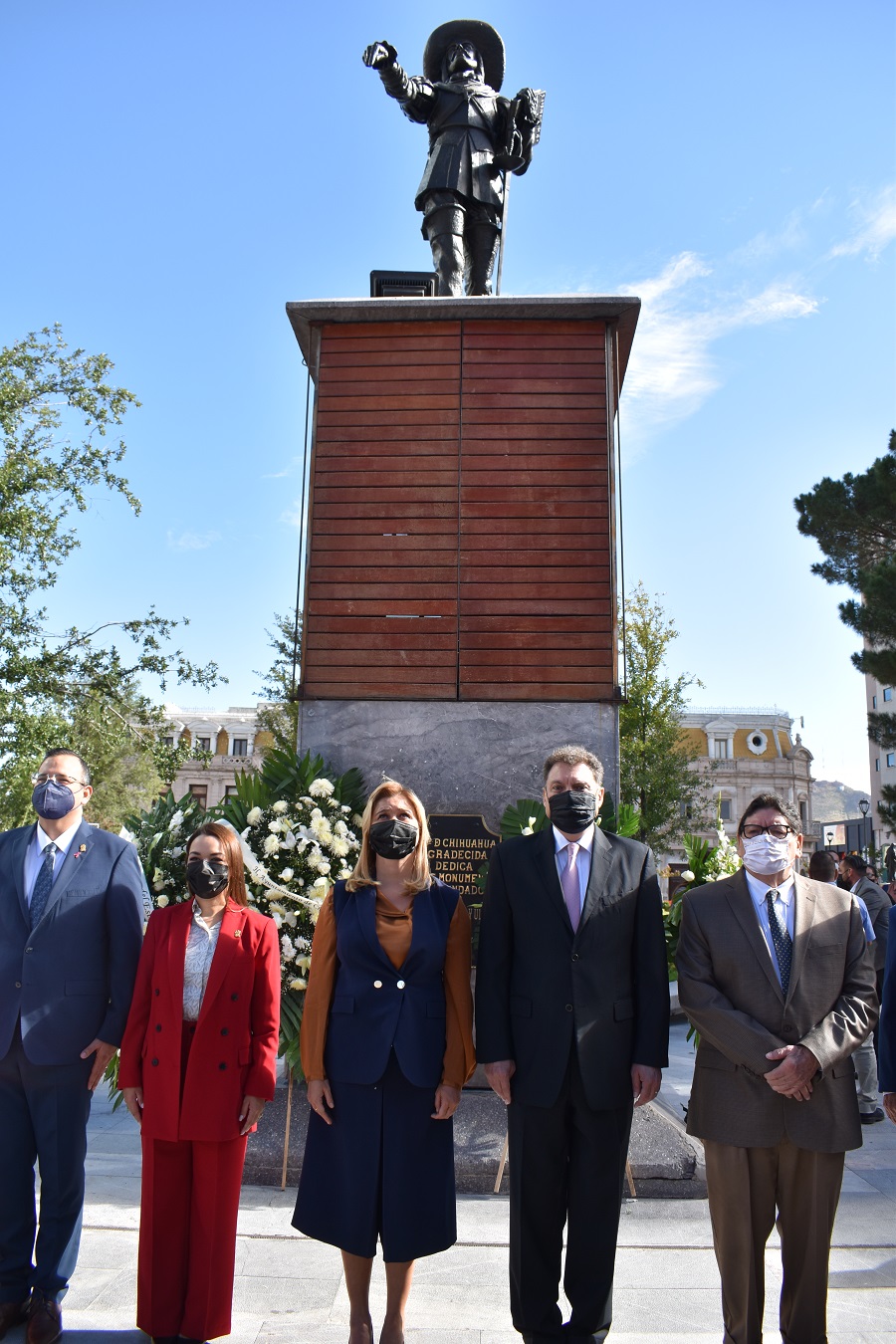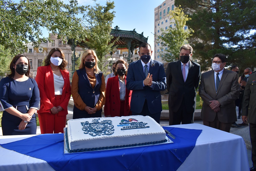 Hoy las autoridades estatales y municipales rindieron honor a los fundadores y a la historia de la ciudad de Chihuahua, con un izamiento de bandera y honores a la enseña patria, además de un acto protocolario, una guardia de honor y un corte de pastel, todo a los pies de la estatua de Deza y Ulloa.