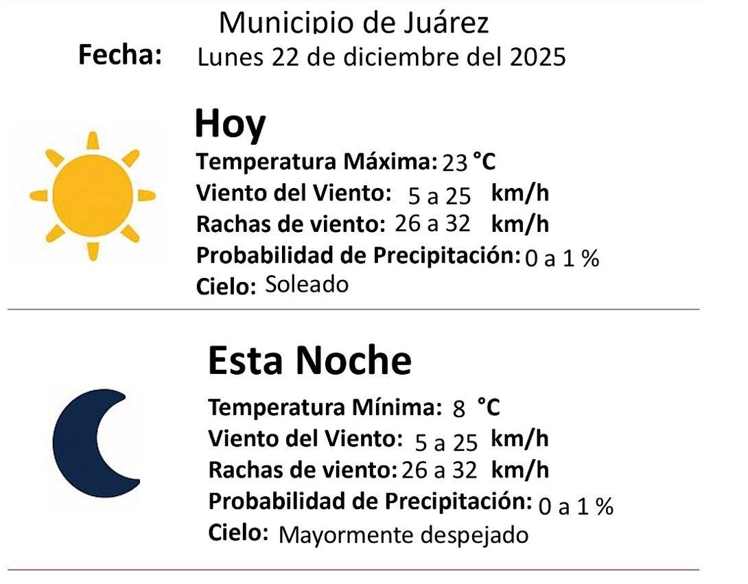 Juárez.- La Dirección General de Protección Civil del Municipio informó el pronóstico del clima para este lunes 22 de diciembre, el cual contempla condiciones mayormente favorables para la ciudad.