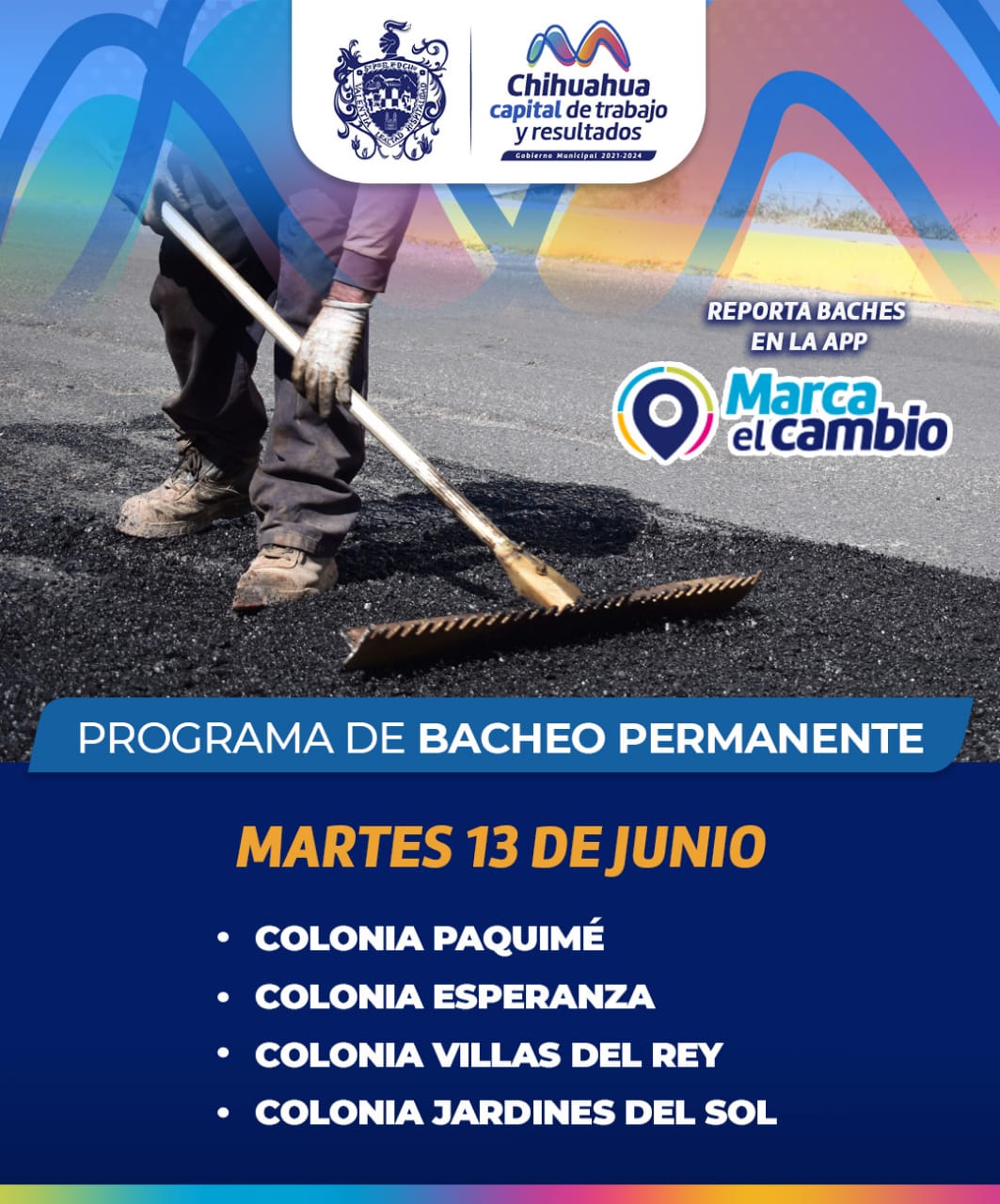Hoy, martes 13 de junio, realizarán labores de bacheo en las colonias Paquimé, Esperanza, Villas del Rey y Jardines del Sol.