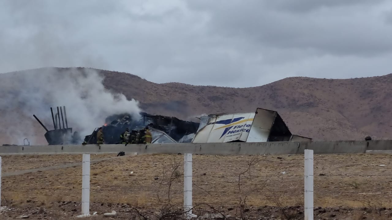 Chihuahua.- El Libramiento Oriente de Chihuahua fue cerrado a la circulación en ambos sentidos, a la altura del kilómetro 41, debido a un fuerte accidente que involucró un tráiler que fue consumido por el fuego.