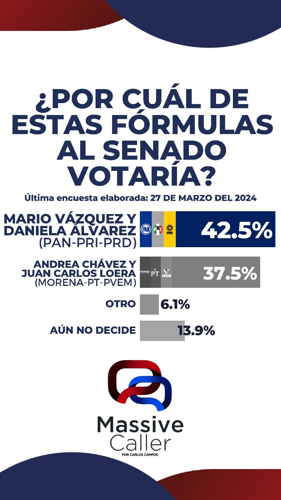 La casa encuestadora Massive Caller en su última medición publicada a finales de marzo muestra a los candidatos de la coalición con un 42.5% frente a 37.5 de los oponentes.