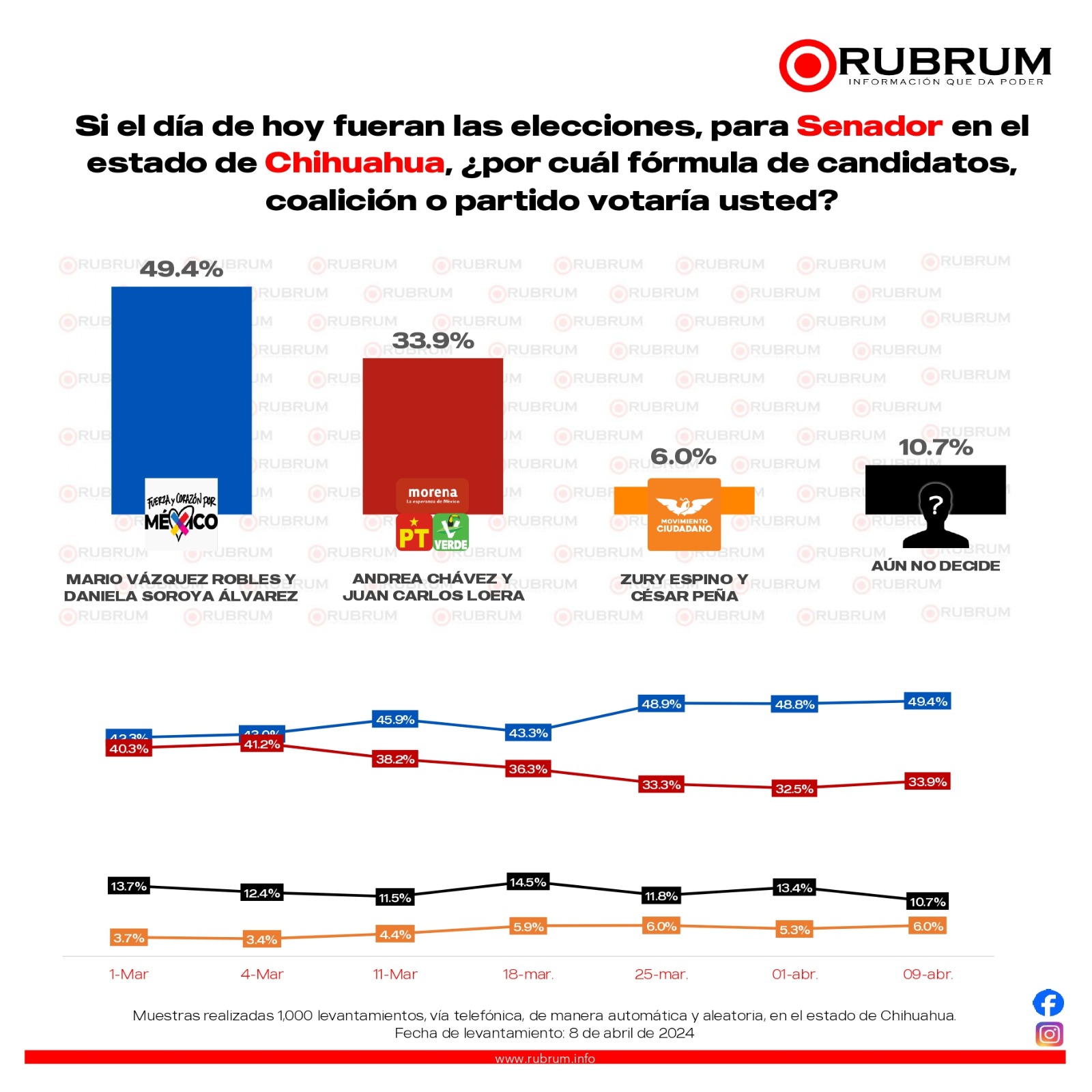 Y la última presentada por Rubrum justo el pasado 9 de abril muestra un avance de éstos con 49.4% contra el 33.9 de los candidatos de Morena.