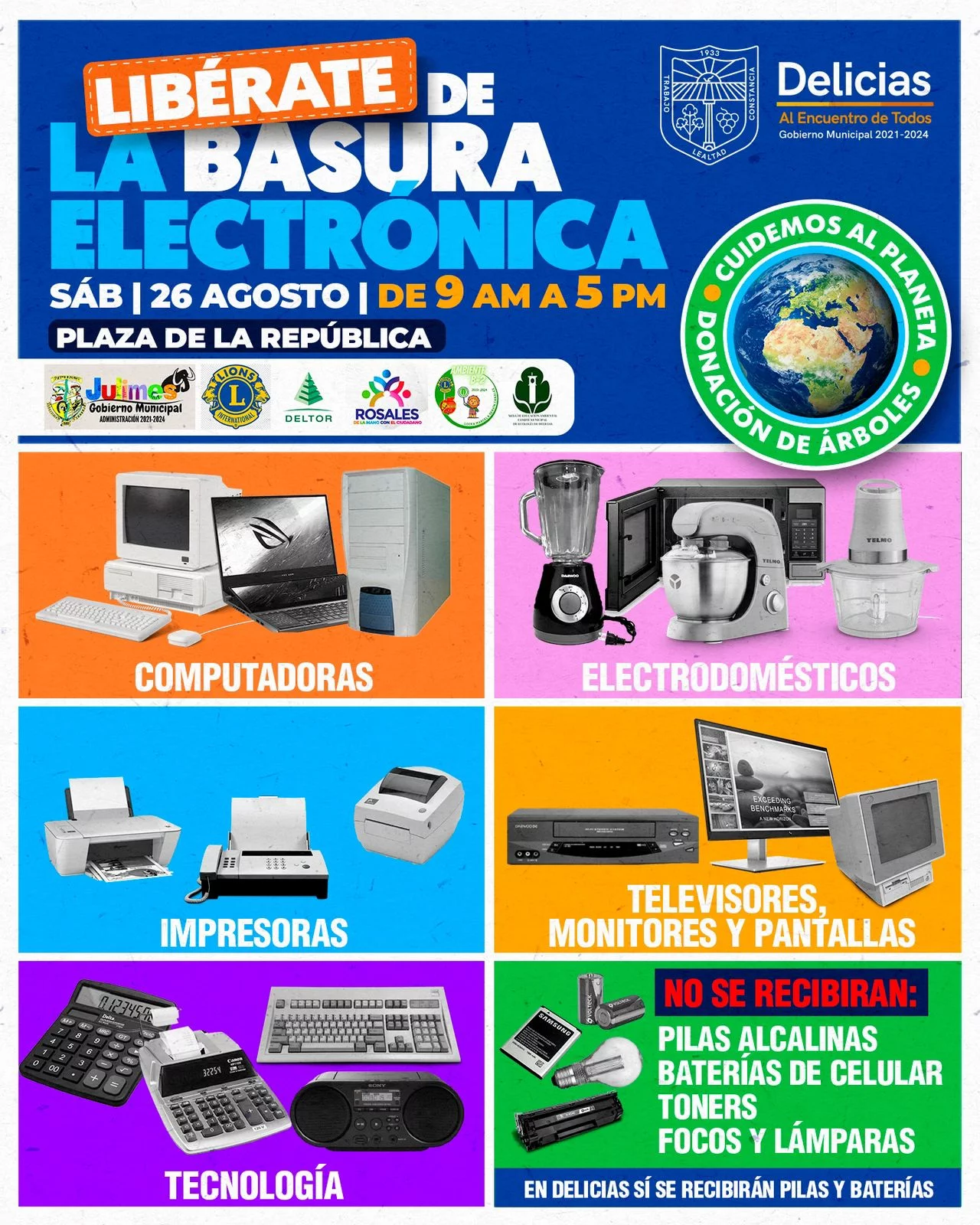 Delicias.- En atención a la petición de la ciudadanía responsable ambientalmente, Medio Ambiente Delicias en conjunto con Club de Leones, la Mesa del comité de Ecología, Municipio de Rosales, el Municipio de Julimes y DELTOR, llevará a cabo el programa Libérate de la Basura Electrónica.