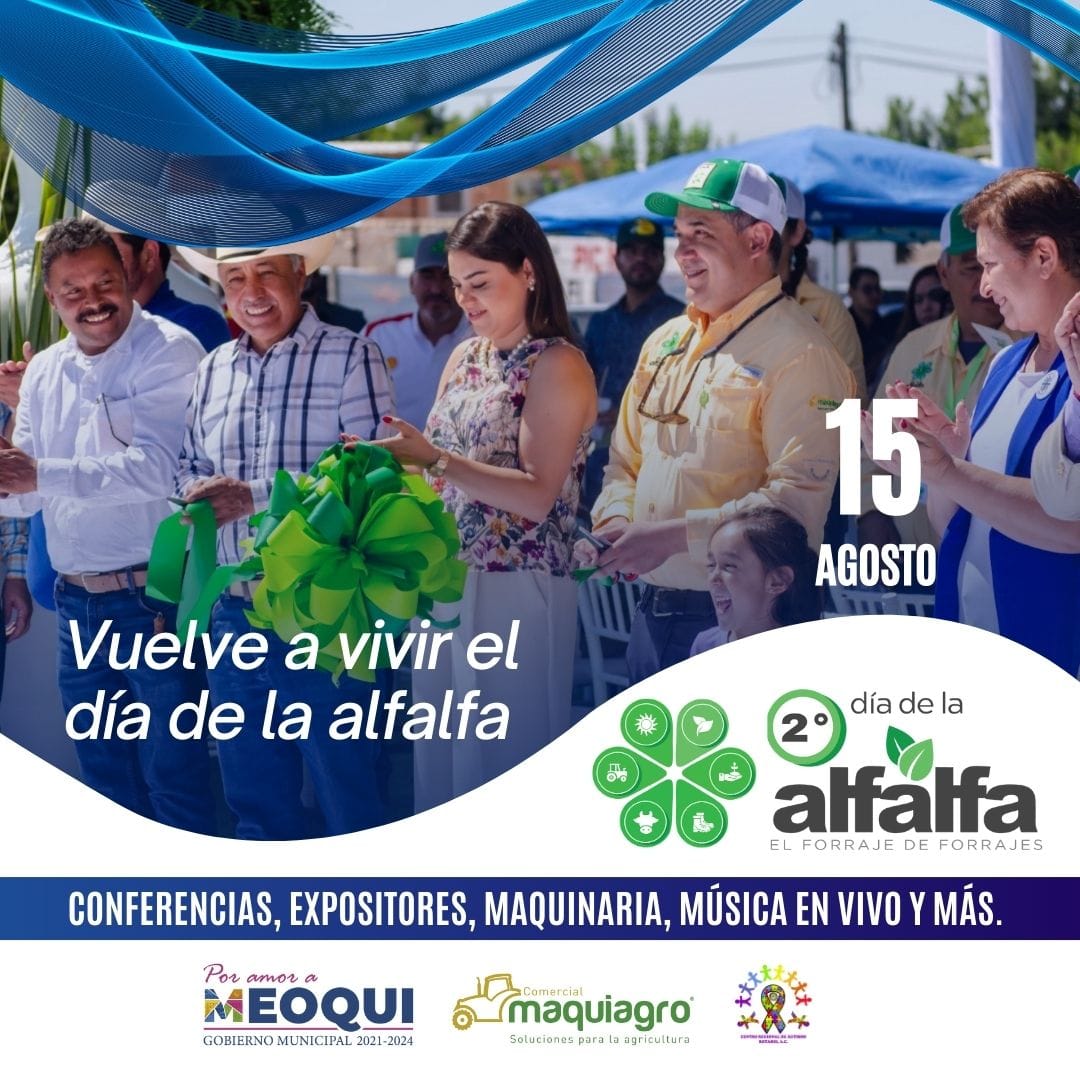 Meoqui.- Ya está todo listo para que este próximo 15 de agosto se lleve a cabo la Segunda Edición del Día de la Alfalfa en Meoqui, donde Comercial Maquiagro, en coordinación con Gobierno Municipal, invitan a las familias, productores, y habitantes de toda la región y del estado para que asistan a este evento, que contará con conferencias, expositores de productos y maquinaria, música en vivo y más sorpresas, llevándose a cabo en el campo de la empresa ubicado en el Molino Rinconeño de 9 am a 5 pm.