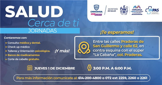 La jornada “Salud Cerca de Ti”, la cual tendrá lugar en la Calle Praderas de San Guillermo esquina con Calle 62 en la colonia Praderas del Sur, el próximo jueves 01 de diciembre en un horario de 16:00 a 19:00 horas.