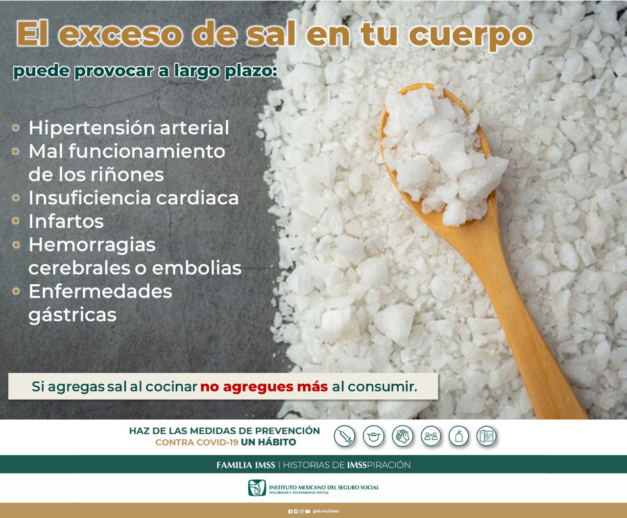 A esto, expresó, se suma que al momento de cocinar los alimentos generalmente se utilizan sazonadores, aderezos y condimentos industrializados para dar más “sabor a la comida”, pero estos contienen cantidades elevadas de sodio; otro factor es que al servir los alimentos, hay quienes sin probarlos les agregan sal, por lo que se recomienda retirar el salero de la mesa durante las comidas.