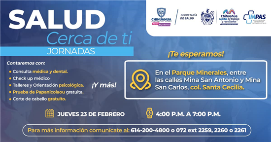 Chihuahua.- El Gobierno Municipal, a través del Instituto Municipal de Prevención y Atención a la Salud (IMPAS), invita a las y los vecinos de la colonia Santa Cecilia a asistir a la jornada “Salud Cerca de Ti”, este próximo jueves 23 de febrero de las 16:00 a las 19:00 horas, en el Parque Minerales ubicado entre las calles Mina San Antonio y Mina San Carlos.