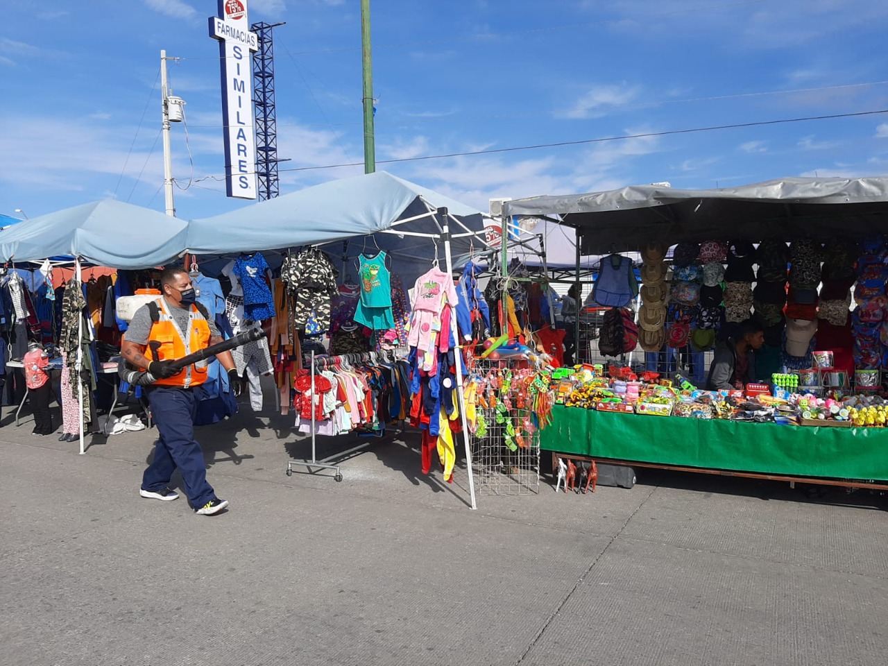 Chihuahua.- El Gobierno Municipal, a través de la Dirección de Mantenimiento Urbano, realiza actividades de desinfección permanente en los diferentes tianguis que se instalan en las colonias de la ciudad, con el fin de disminuir los contagios por COVID19.