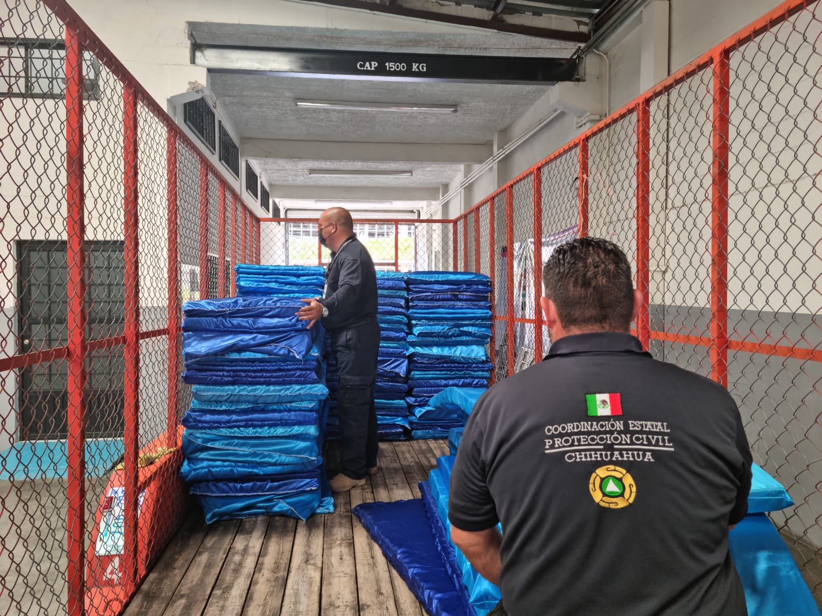 En el caso de Ojinaga, la entrega incluyó 100 colchonetas y 100 cobijas; mientras que para el municipio de Parral, se brindaron 61 láminas, 26 polines, pintura, 46 costales de cemento, y 12 Armex para construcción.