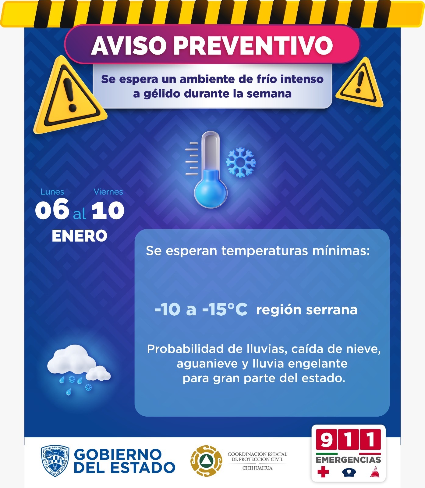 El Gobierno del Estado exhorta a la población tomar las previsiones necesarias para protegerse del clima gélido y mantenerse informada a través de los canales oficiales.