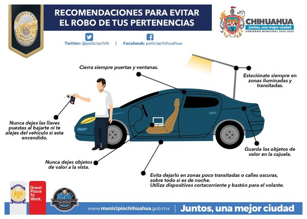 La Policía Municipal recomienda a los automovilistas que todos los objetos de valor que carguen consigo y tengan la necesidad de dejar al interior del vehículos, sean colocados en la cajuela o bien ocultos bajo los asientos, nunca a simple vista, además de asegurarse que los vidrios y puertas queden debidamente cerrados.