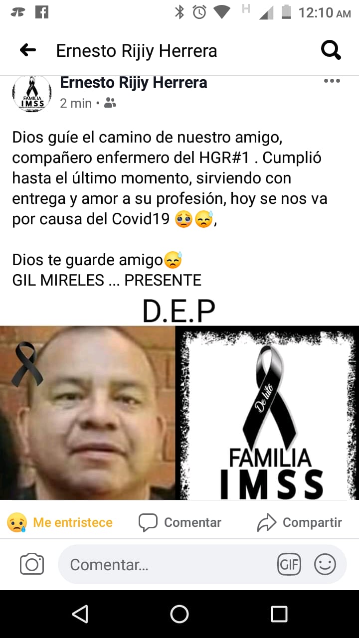 Gilberto Mireles, enfermero del Hospital Morelos del IMSS en Chihuahua falleció la noche de este domingo, luego de haber sido reportado en fase crítica después de presentar una lesión renal aguda a consecuencia de contagiarse de Covid-19.