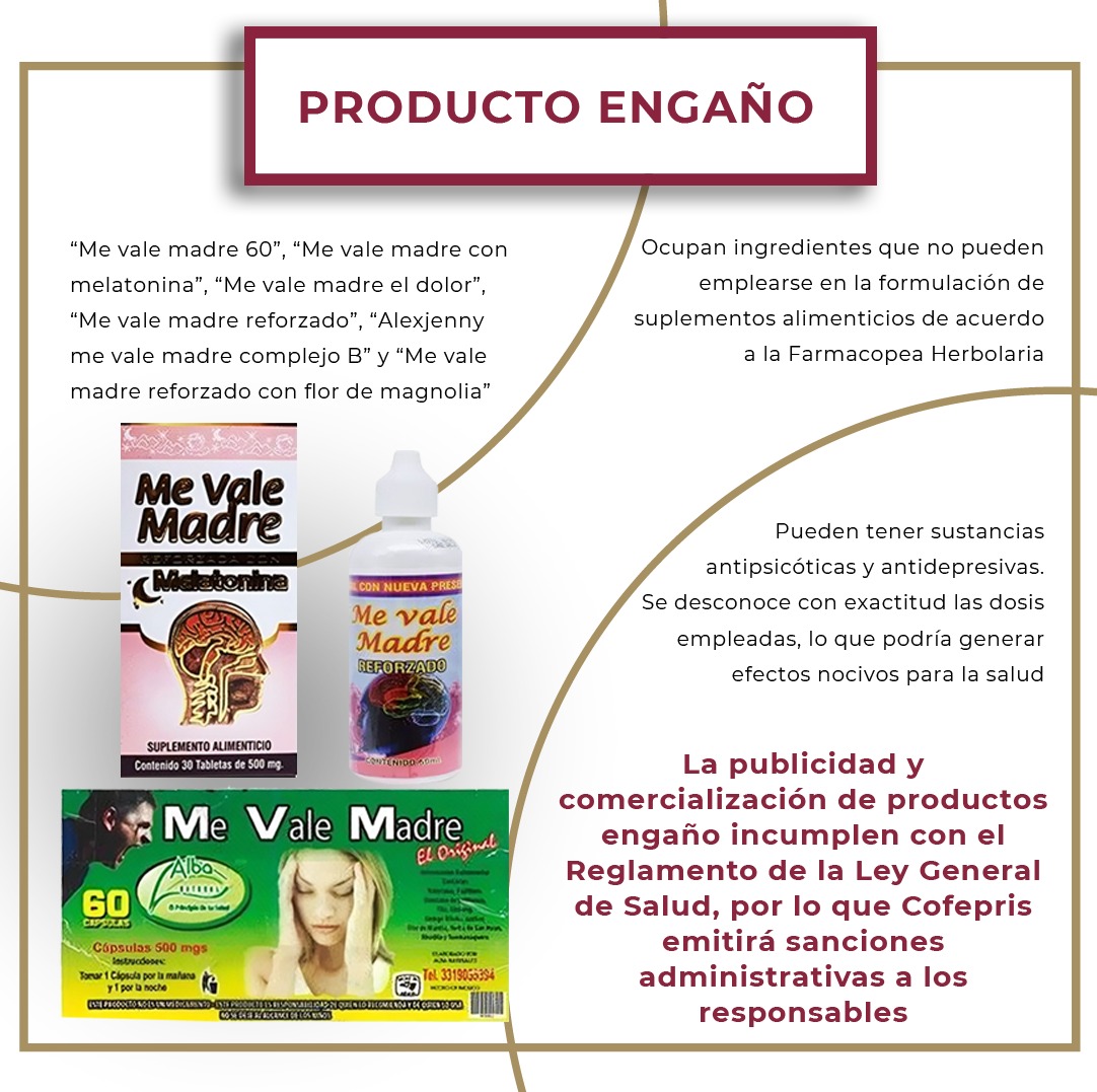 México.- Los productos engaño representan riesgos significativos a la salud de quienes los consumen, es por ello que la Comisión Federal para la Protección contra Riesgos Sanitarios (Cofepris), alerta sobre “Chupa panza”, “Shupanza”, “Chupapanza”, “Me vale madre 60”, “Me vale madre con melatonina”, “Me vale madre el dolor”, “Me vale madre reforzado”, “Alexjenny me vale madre complejo B” y “Me vale madre reforzado con flor de magnolia”.