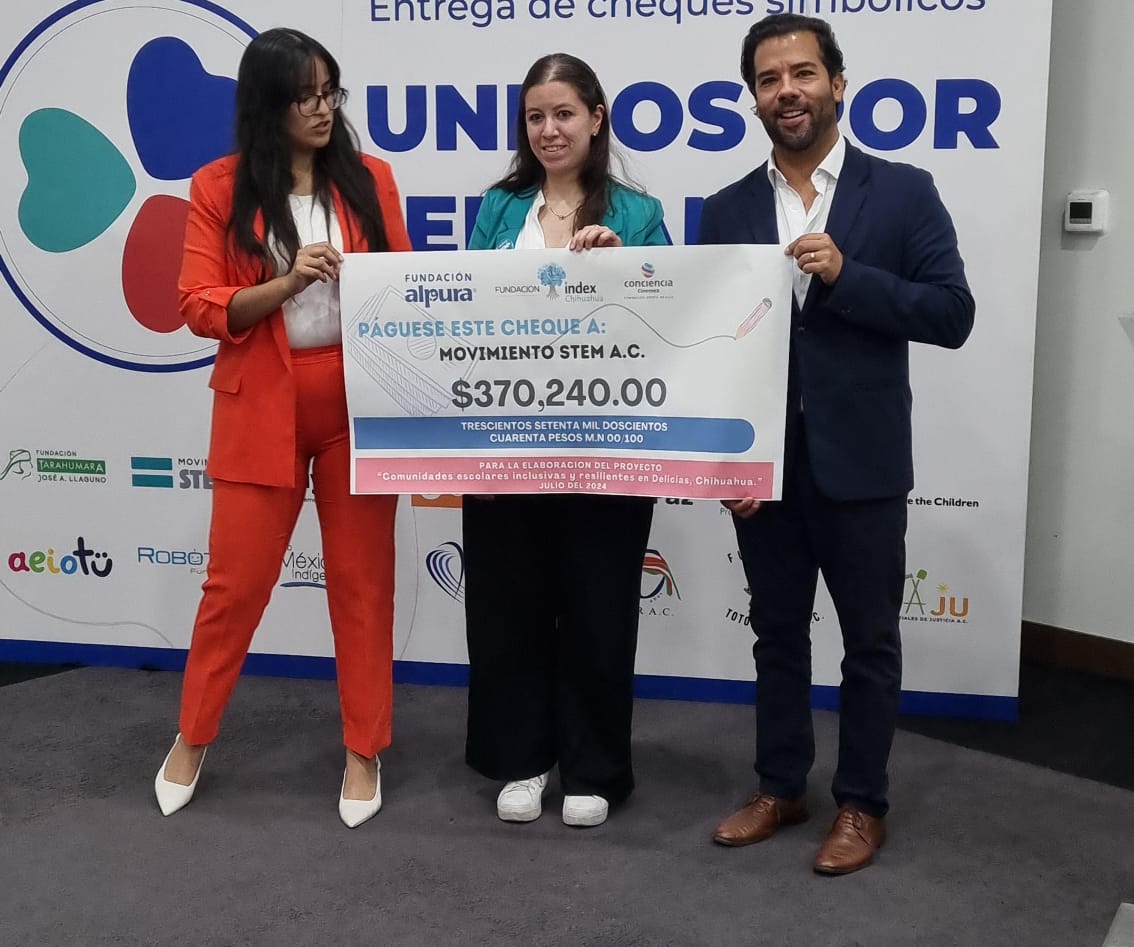 Chihuahua.- Este lunes, INDEX entregó simbólicamente un apoyo económico para 14 asociaciones civiles de la campaña “Unidos por el Cambio”, acto que fue encabezado por el presidente de Index, René Espinoza; el gerente de Fundación Alpura, Armando Márquez; por Fundación Cinemex, Lucero Vallejo.