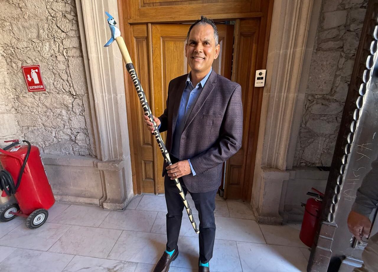 Chihuahua.- El Secretario de Seguridad Pública Estatal, Gilberto Loya Chávez, recibió el Bastón de Mando por parte del presidente del Gran Consejo Supremo Indígena, Enoel Carrasco Jordán, en un acto simbólico de reconocimiento por las acciones implementadas en favor de la seguridad en la Sierra Tarahumara.