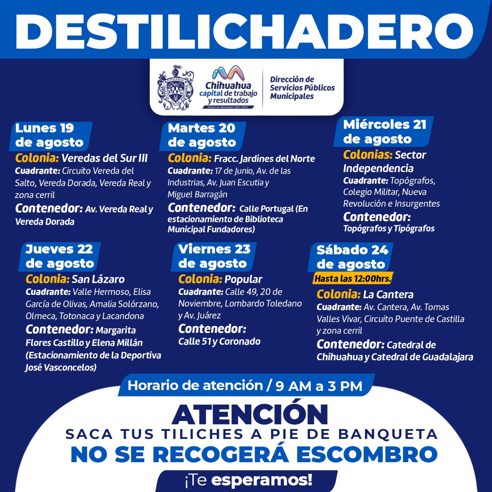 Chihuahua, Chih.- Para evitar acumulaciones de basura de grandes dimensiones en las viviendas, que podría generar plagas o problemas de salud, el Gobierno Municipal, a través de la Dirección de Servicios Públicos Municipales, informa el calendario del programa Destilichadero, que se realizará del 19 al 24 de agosto en seis colonias de la Capital.