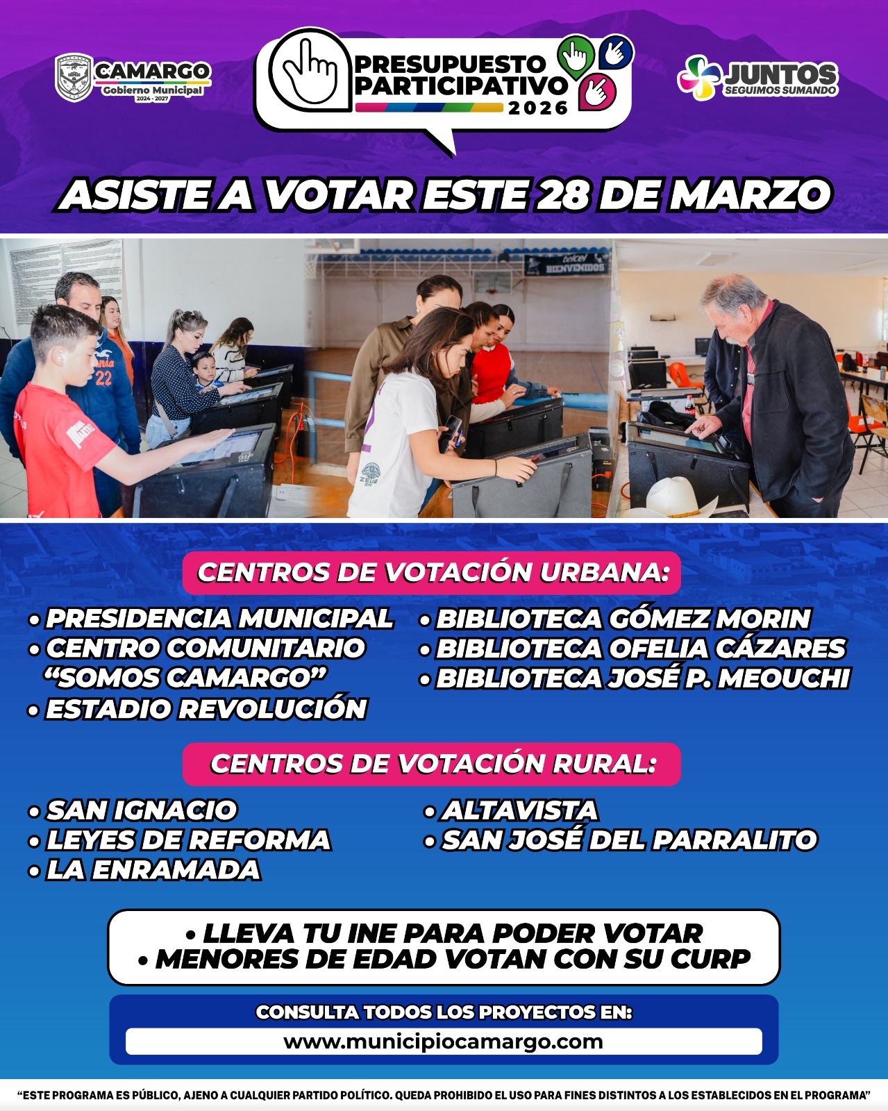 Camargo.- El Gobierno Municipal de Camargo invita a toda la ciudadanía a ejercer su derecho a participar en la toma de decisiones sobre el desarrollo del municipio, acudiendo a votar este sábado 28 de marzo dentro del ejercicio de Presupuesto Participativo 2026.