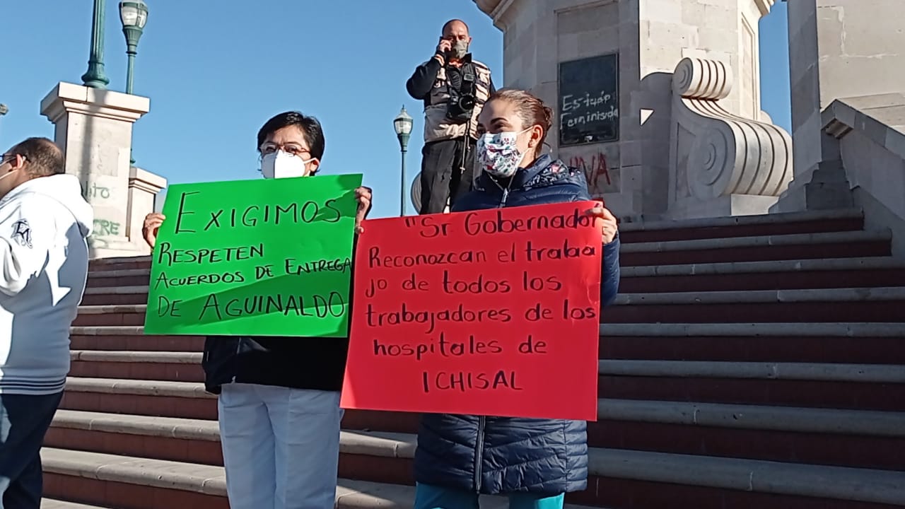 Esta mañana, cerca de 100 empleados pertenecientes al Instituto Chihuahuense de la Salud (Ichisal) se manifestaron de manera pacífica en la Plaza del Ángel, en exigencia del pago del aguinaldo por parte de la Secretaria de Hacienda del Gobierno Estatal.