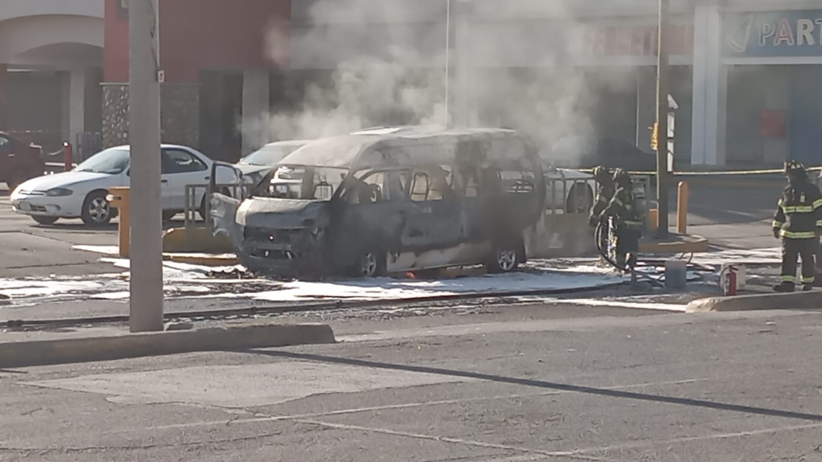Chihuahua.- Los cuerpos de emergencia trabajan para sofocar el fuego que consumió una camioneta de transporte de personal en las inmediaciones de la avenida Zaragoza y la calle Pimentel, a un costado de la tienda Alsuper.