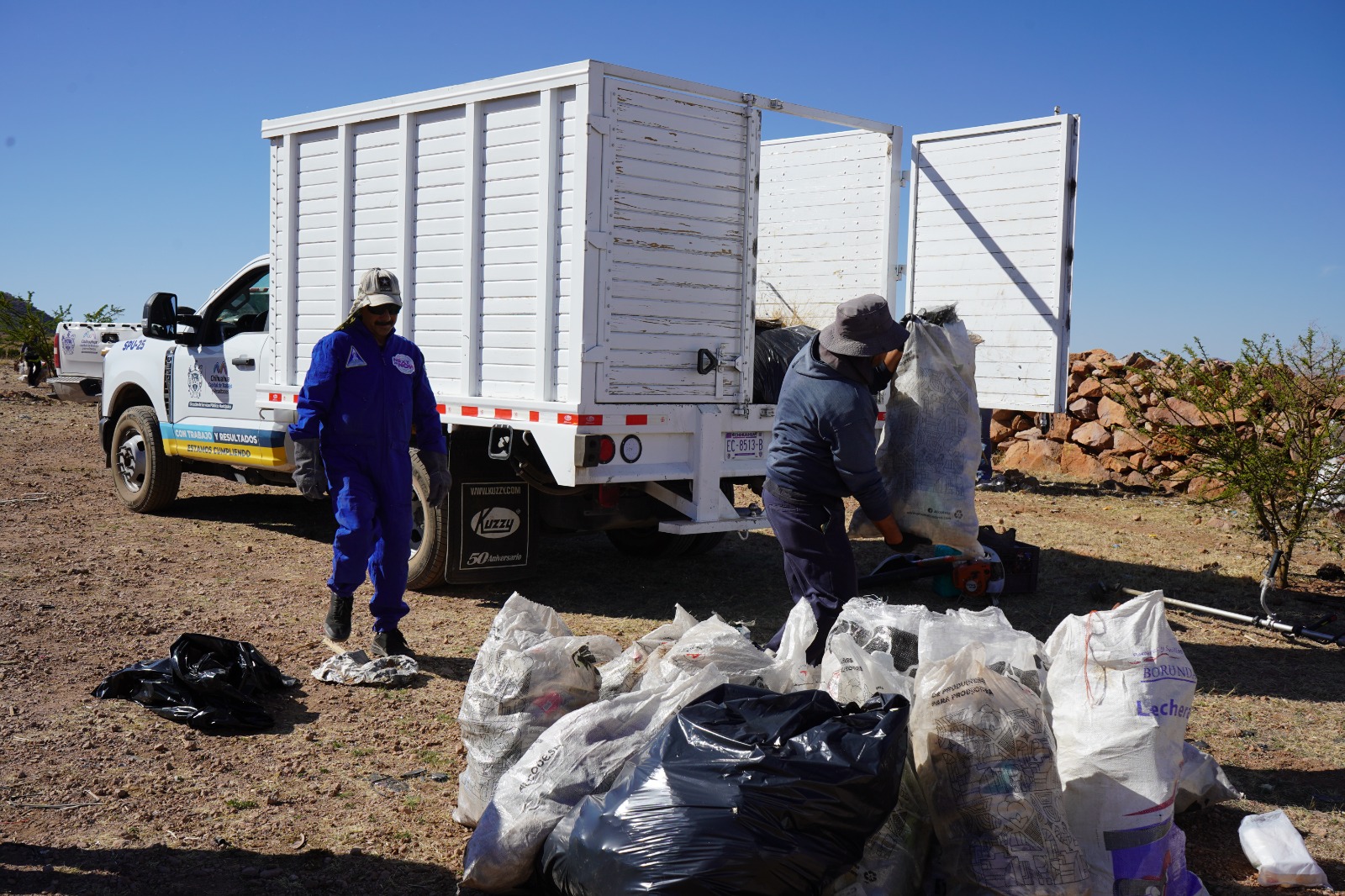 Chihuahua.- El Gobierno Municipal, a través de la Dirección de Desarrollo Rural y habitantes de la comunidad, realizaron la limpieza de un basurero clandestino ubicado en el seccional de El Charco.