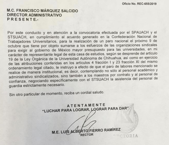 En Chihuahua, el secretario general del Sindicato del Personal Académico de la UACH (Spauach), Benito Aguirre Sáenz , informó que realizarán el paro como lo acordaron todos los trabajadores de la universidad, incluyendo a los no sindicalizados, y las labores se reanudarán con normalidad el 10 de octubre.