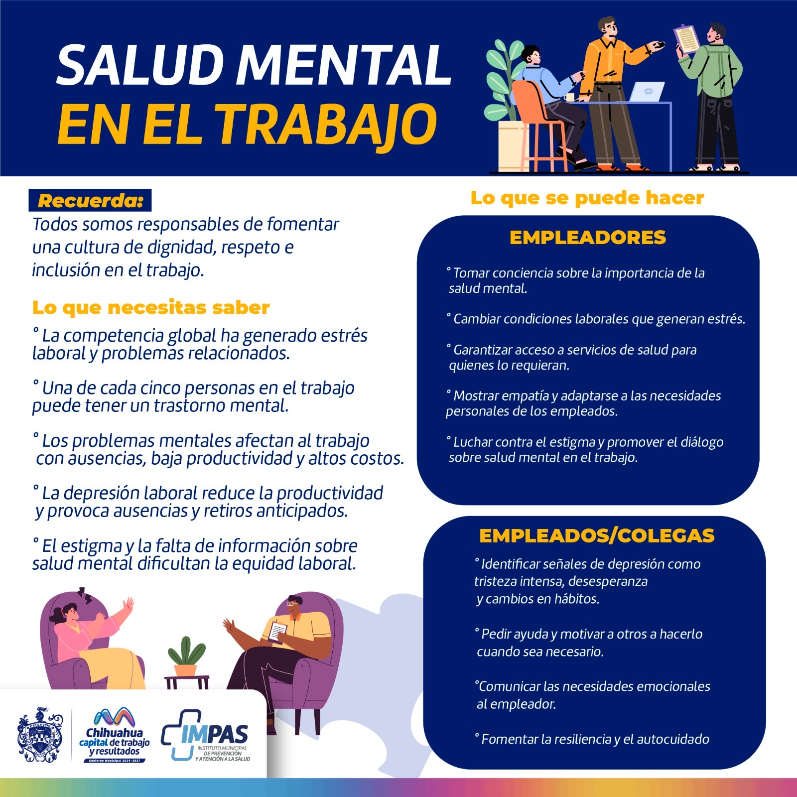 Chihuahua, Chih.- En el marco del Día del Trabajo, el Gobierno Municipal, a través del Instituto Municipal de Prevención y Atención a la Salud (IMPAS) destaca la importancia de la salud mental en el entorno laboral y emite recomendaciones para cultivar un ambiente que fomente el equilibrio y la felicidad.