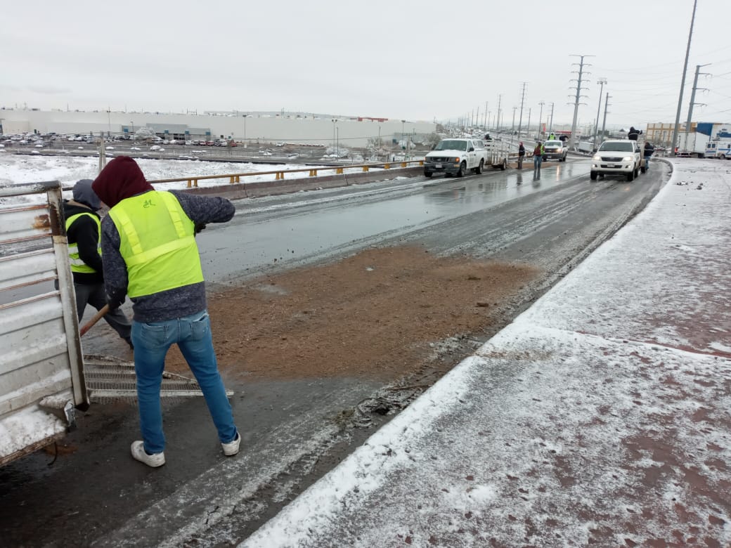 En tanto la Dirección General de Obras Públicas lleva a cabo las labores en el puente ubicado en las avenidas Teófilo Borunda y Óscar Flores Sánchez, en donde se esparcieron dos toneladas y media de arena.