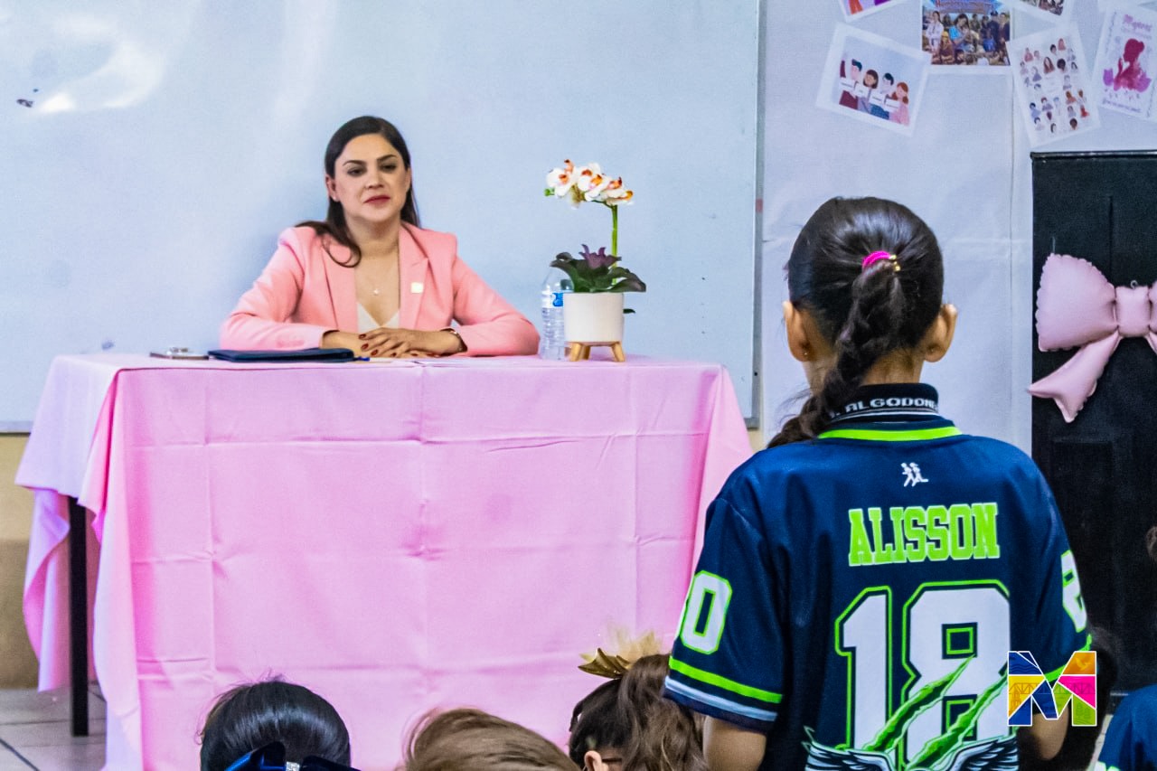 Delicias.- En el marco del Día Internacional de la Mujer, la alcaldesa de Meoqui, Miriam Soto, impartió una plática a alumnos de sexto grado de la Escuela Primaria Algodoneros 2080, de Delicias, como parte del programa “Mujeres que Inspiran”, donde fue invitada por la maestra Lucero Navarrete como ponente para compartir su experiencia en el servicio público.