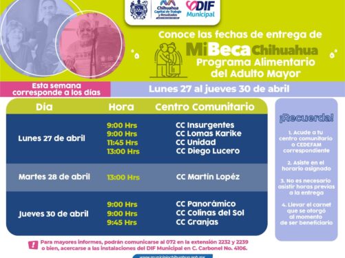Leer másChihuahua.- El DIF Municipal informa a las y los solicitantes del Programa Alimentario del Adulto Mayor (PAAM) los horarios y puntos de entrega, correspondientes a la semana del 27 al 30 de abril, en los ...