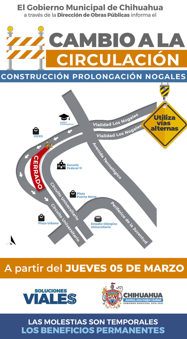 A partir de este jueves se realizará el cambio a la circulación sobre Circuito Universitario, desviando el tráfico de manera provisional a una calle contigua al circuito, por lo que el Gobierno Municipal a través de la Dirección de Obras Públicas, exhorta a tomar las medidas necesarias para llegar a tiempo a su destino y seguir los señalamientos preventivos que se encuentran en el lugar.