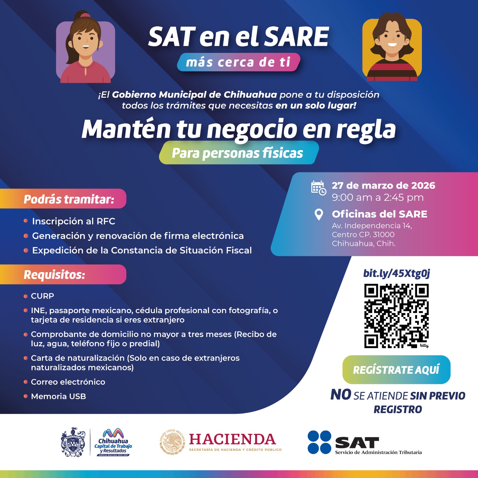 Chihuahua, Chih.- El Gobierno Municipal de Chihuahua, a través de la Dirección de Desarrollo Económico y Competitividad y en coordinación con el Servicio de Administración Tributaria (SAT), realizará una nueva jornada del programa “SAT en el SARE”, iniciativa que desde 2021 ha beneficiado a 673 personas al acercar trámites fiscales de forma ágil y accesible.