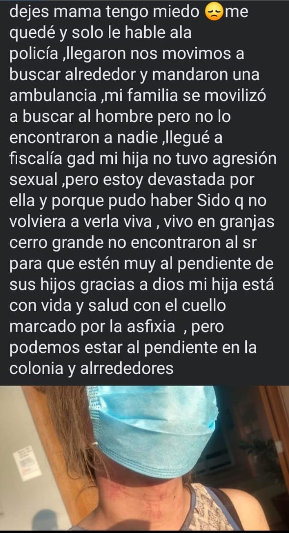 La mujer relató que al llegar su hija le contó que fue agredida por un hombre desconocido quien la golpeó y asfixió hasta dejarla sin conocimiento en un arroyo que debe cruzar para llegar a su hogar.