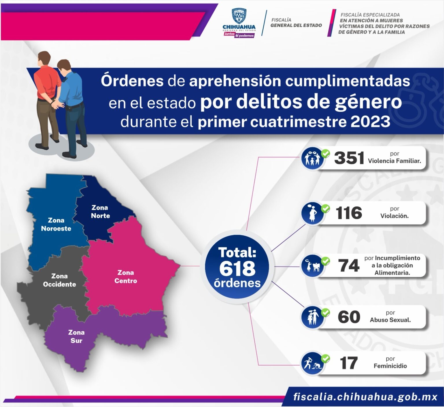 Chihuahua.- Durante el primer cuatrimestre del año, la Fiscalía Especializada en Atención a las Mujeres Víctimas del Delito por Razones de Género y a la Familia (FEM), alcanzó la cifra de 618 órdenes de aprehensión en contra de quienes cometieron delitos de género en el Estado de Chihuahua.